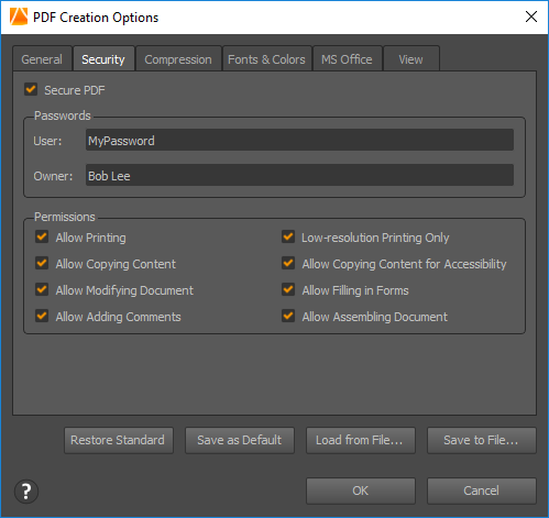 Permissions that disallow printing, copying content, modifying a document, adding comments, filling in forms, and assembling documents can also be set accordingly.